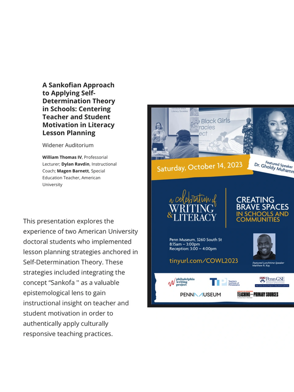 This template strategically integrates the concept of Sankofa as a valuable epistemological lens to gain instructional insight on teacher and student motivation in order to authentically apply culturally responsive teaching practices. The findings of its pilot study was presented at the University of Pennsylvania on October 14, 2023.